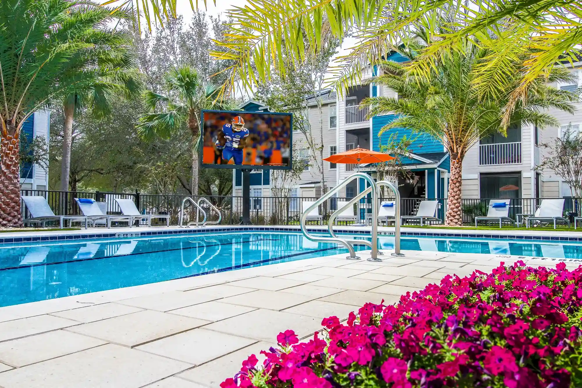 Our resort-style pool area is the place to be when the weather heats up in Gainesville. Head to the game lounge to chill out, or get physical with a game on the basketball court, or volleyball court.